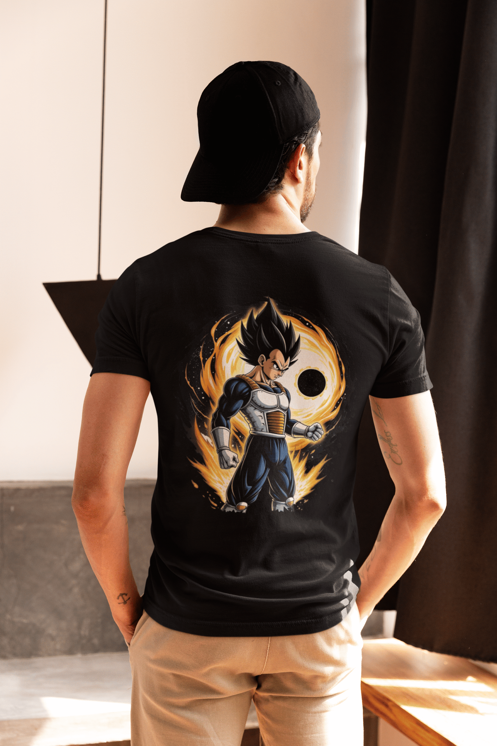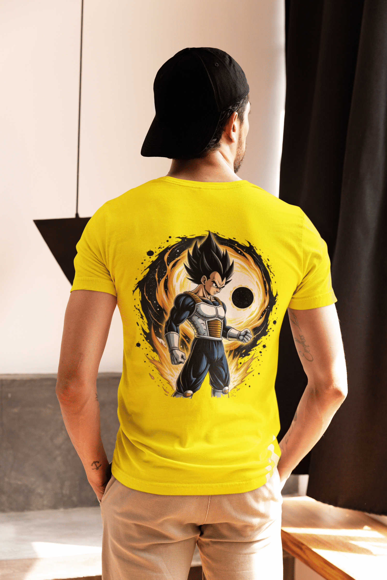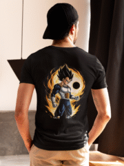 Unleash your inner warrior with this bold and stylish Dragon Ball-inspired Vegeta printed T-shirt. Designed on a vibrant royal blue base, the tee features an electrifying artwork of Vegeta surrounded by a fiery aura, symbolizing strength, power, and determination. Crafted with high-quality fabric, this T-shirt offers both comfort and durability, making it perfect for casual wear, anime events, or as a standout piece in your collection.