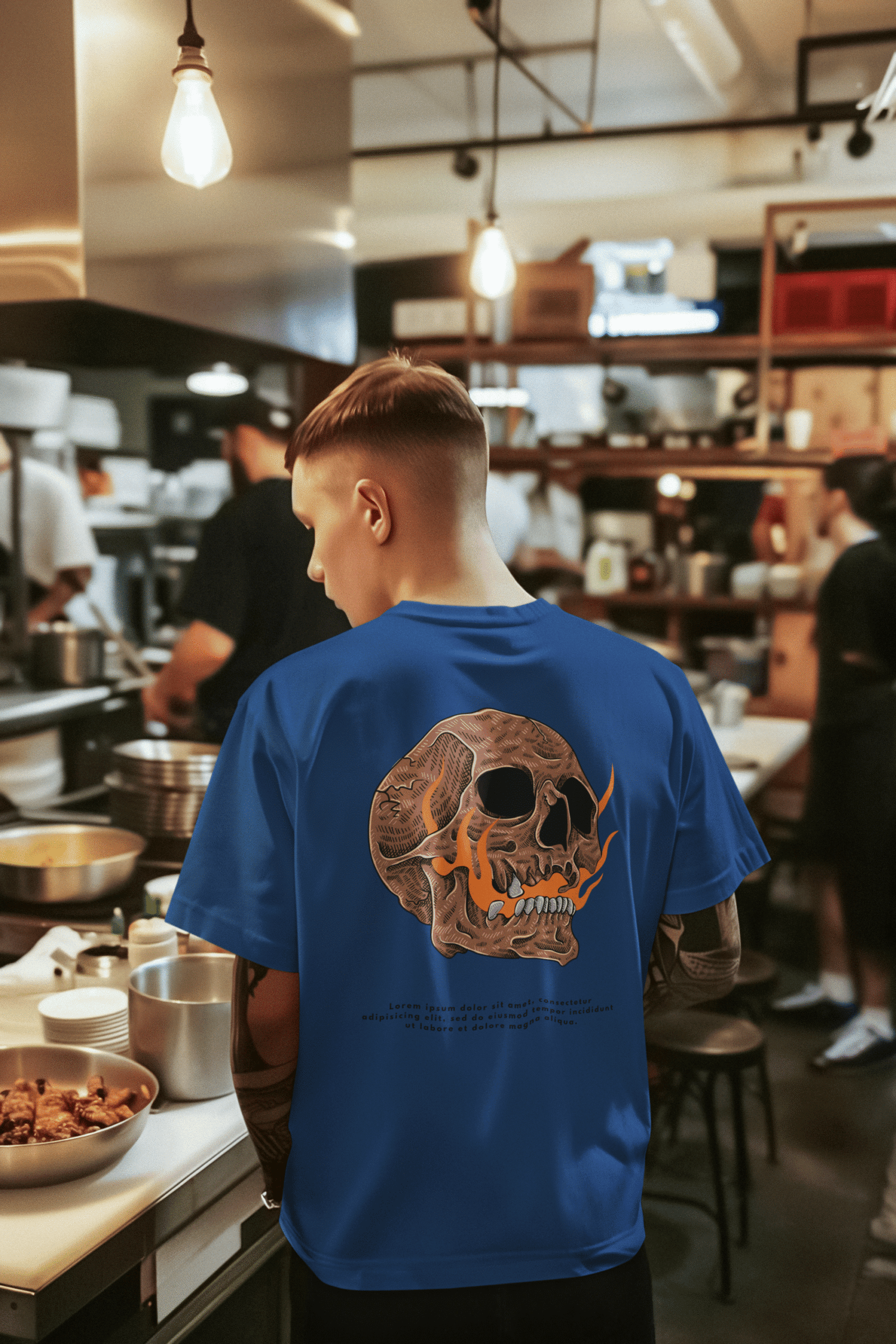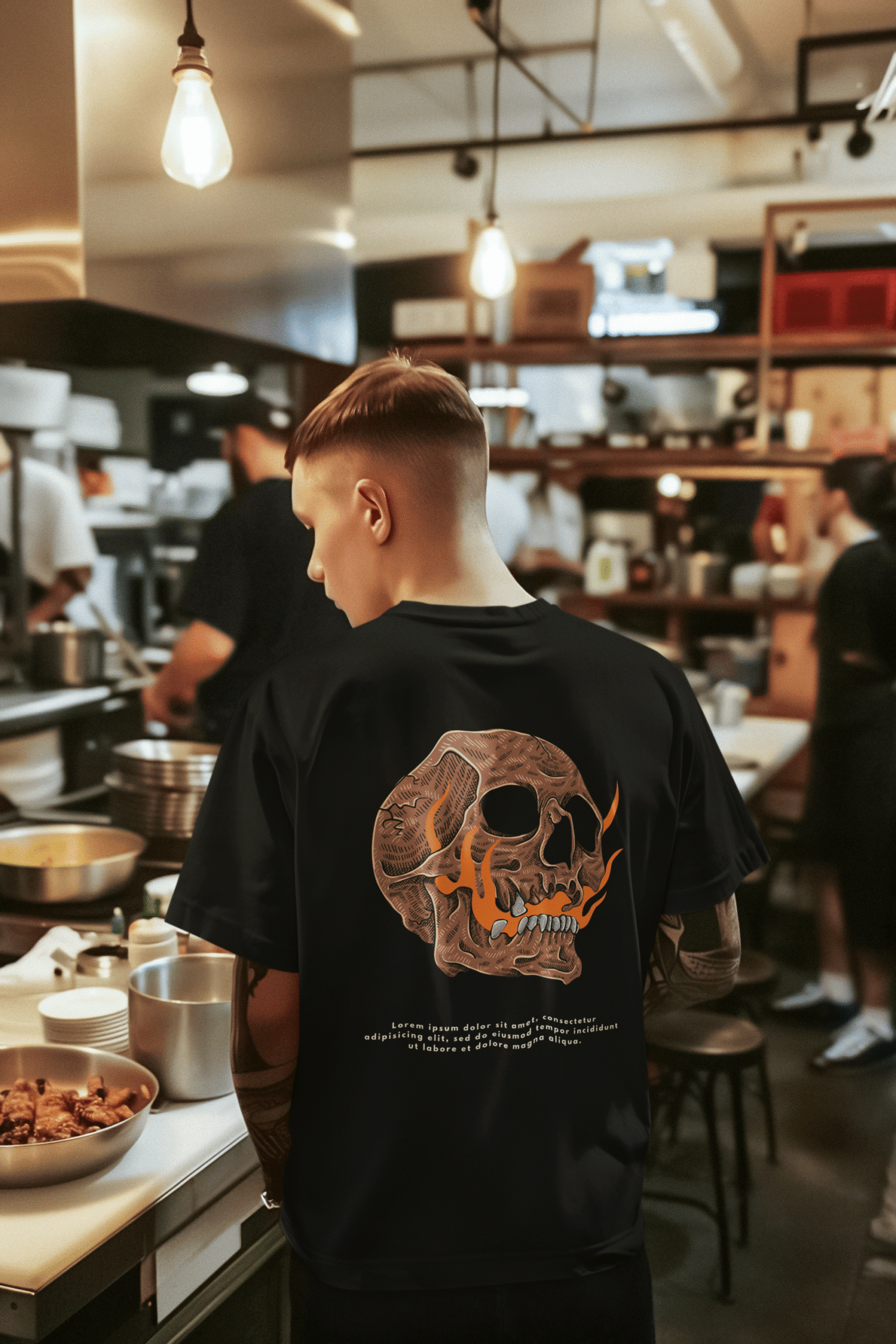 Turn up the heat on your style with this Flaming Skull Graphic T-Shirt. Designed with a striking skull illustration engulfed in fiery orange flames, this tee is the perfect blend of edgy and bold streetwear. The detailed artwork on the back makes it a true statement piece for anyone who loves gothic-inspired fashion or standout graphic tees. Crafted from soft, breathable fabric, this shirt offers comfort with attitudeโideal for casual outings, concerts, or everyday wear. Pair it with jeans, joggers, or a streetwear jacket for a fearless look.