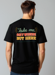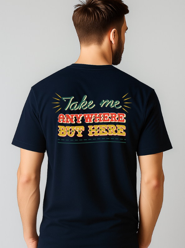 Step into bold style with this trendy black T-shirt featuring a vibrant back print that says โTake me anywhere but hereโ. Designed with eye-catching retro-inspired typography in a mix of neon green, fiery red, and golden yellow, this tee perfectly captures the spirit of wanderlust and adventure. Made from soft, breathable fabric, itโs ideal for casual outings, travel days, or simply making a statement wherever you go.